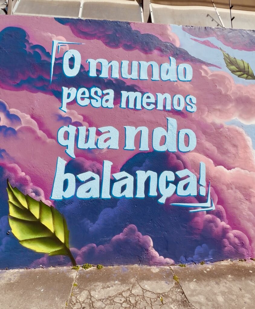 Gael é autista, nível 3 de suporte, e não se comunica verbalmente. No mural, ele aparece brincando no balanço, uma atividade que, segundo o artista, ajuda na regulação sensorial. A cena é acompanhada da frase “O mundo pesa menos quando balança”, que sintetiza essa relação com o movimento.